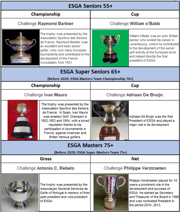 In 2019 the General Assembly decided to change the age class for ESGA Masters Team Championship & Cup from 70+ to 65+. From 2020 it was introduced new names for 65+ and 75+: